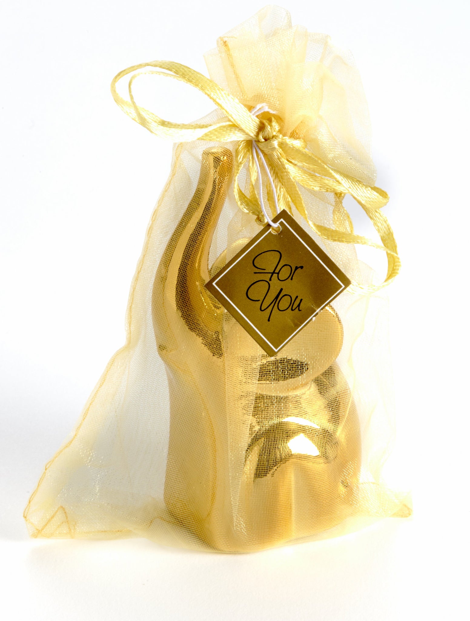 - One package contains 4 elephants each individually gift packaged with gold organza bag with drawstring closure, ribbon and bow plus a "For You" gift tag.