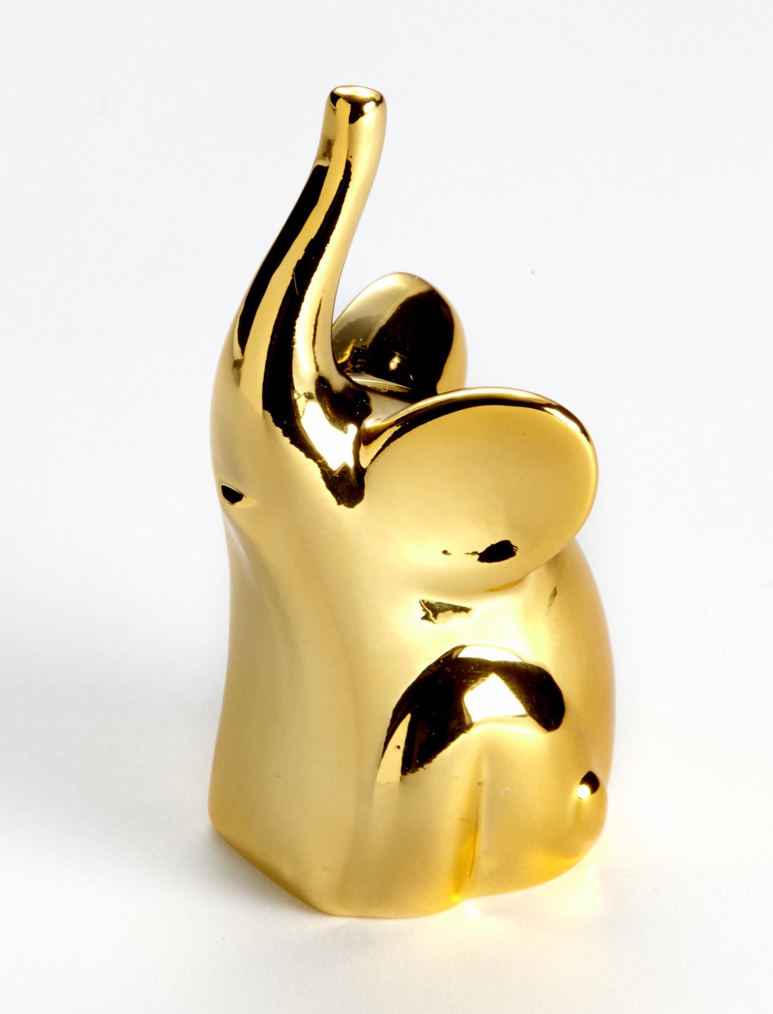 Get lucky in love and bring good fortune to your home with this beautiful elephant figurine finished in stunning electroplated gold color finish. The raised trunk is said to shower you with good fortune and serves to hold and display your treasured rings. Gorgeous as a wedding favor for guests or any gift giving occasion. The lucky elephant has a range of positive meanings across cultures. In Indian, Southeast and Far East Asian cultures it is also a symbol of royalty, fertility and important in feng shui. Gift packaged and ready to give. By Artisano Designs.